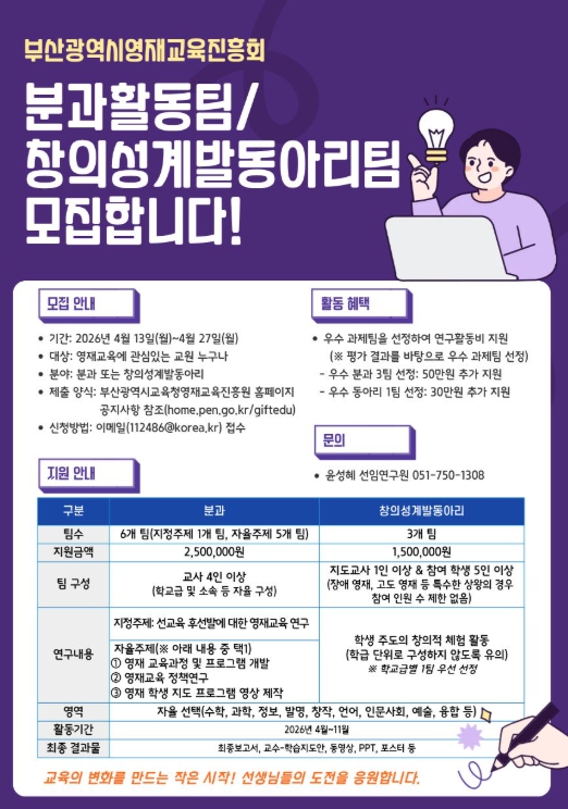 ![]() ‘2026 영재교육 연구과제 팀’ 공개 모집 |