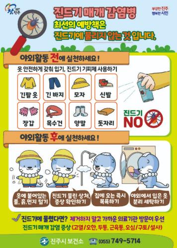 진주시는 기온 상승으로 진드기 활동이 증가하는 가운데, 봄철 야외활동이 늘어나면서 중증열성혈소판감소증후군, 쓰쓰가무시증 등 진드기 매개 감염병을 예방할 수 있도록 감염병 예방 수칙을 철저히 지킬 것을 당부했다.
