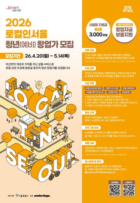 참여자 모집은 4월 20일부터 5월 14일까지 진행된다. 대상 상권은 ▲강서구 마곡미술길 ▲광진구 건대입구청춘대로 ▲동작구 노량진만나로 ▲중구 중앙아시아거리 등 로컬브랜드 5기 상권 4곳이며, 각 상권에서 창업할 청년 총 24팀을 선발한다. 서울시에 거주하는 만 19~39세 청년이라면 개인 또는 3인 이내 팀으로 지원할 수 있다.