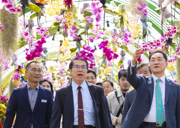 ![]() 오른쪽부터 농업생태원을 둘러보는 정장선 평택시장, 황웨이저 대만 타이난시장, 이우진 평택시 농업기술센터 소장 |