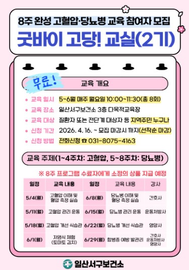 2026년 고혈압·당뇨병 교육상담 표준화 사업의 일환으로 진행되는‘굿바이 고당! 교실’은 고혈압·당뇨병 질환자 또는 전 단계 대상 등의 건강에 관심있는 지역 주민이라면 누구나 참여할 수 있다.