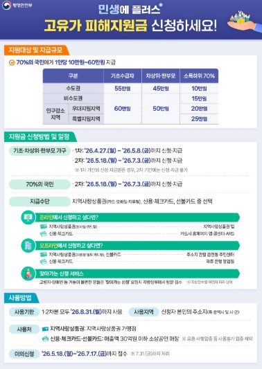 이어 2차 신청 대상자인 소득 하위 70%(약 13만 명 추산)에게도 10만 원을 지급해 유가 상승으로 인한 물가 부담을 전방위적으로 완화할 계획이다.