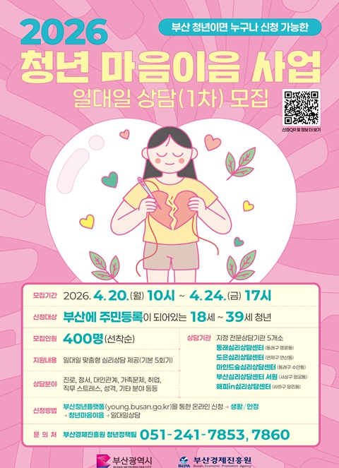 상담은 전문 상담기관 상담실에서 진행하며, 시는 참여 청년들의 접근성과 편의를 높이기 위해 '부산청년센터'를 비롯한 지역 내 청년공간도 상담 장소로 적극 활용할 계획이다.