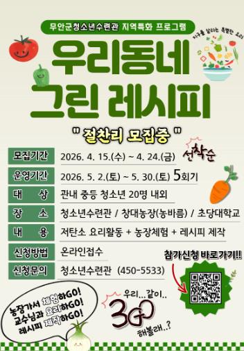 무안군청소년수련관은 ‘우리동네 그린레시피’ 프로그램 참가자를 오는 4월 24일까지 모집한다고 밝혔다.