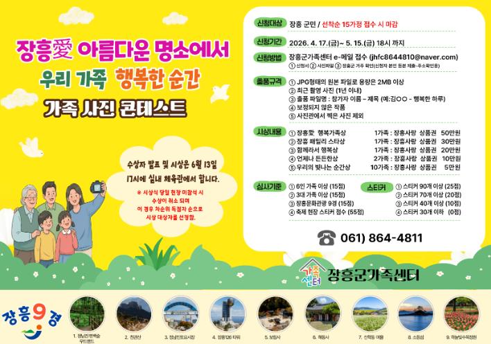 장흥군가족센터 관계자는 “이번 가족사진 콘테스트는 가족 간의 소중한 추억을 공유하고, 장흥의 아름다운 관광지를 널리 알리는 뜻깊은 행사”라며 “군민 여러분의 많은 관심과 참여를 바란다”고 말했다.