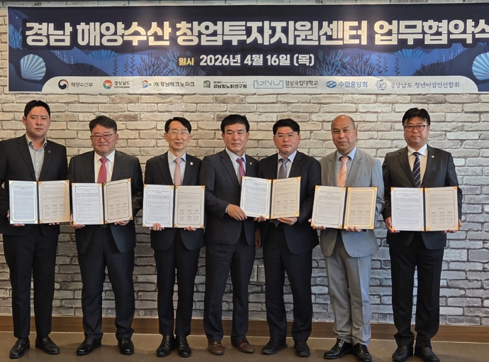 ![]() 경상국립대학교(GNU) 해양과학대학은 경상남도 해양수산 창업투자 활성화를 위해 4월 16일 경남테크노파그에서 경상남도, 경남테크노파크, 경남항노화연구원, 수협중앙회 경남본부, 경상남도 청년어업인연합회 등과 업무협약(MOU)을 체결했다. |