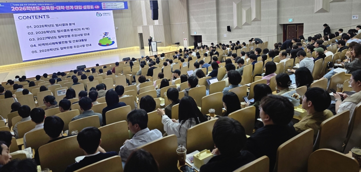 ![]() 18일 전남대학교 용지관 컨벤션홀에서 고3 진학부장, 담임교사, 대입 전문 디렉터 등 300여 명이 참석한 가운데 ‘2026학년도 교육청-대학 연계 대입 설명회’ 를 진행하고 있다. |