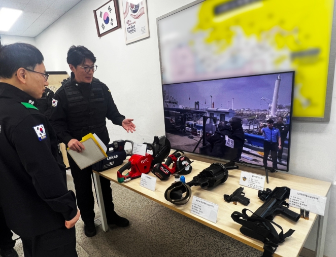 ![]() 불법 외국어선 대응 장구류를 점검 중인 중부해경청장. |