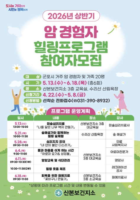 김미경 보건소장은 “암 치료 과정에서 발생하는 신체적·정신적 부담으로 어려움을 겪는 암 경험자와 가족들이 이번 프로그램을 통해 심리적 위로와 정서적 안정을 얻고, 일상으로의 건강한 복귀에 도움이 되기를 기대한다”며 “앞으로도 암 경험자의 삶의 질 향상을 위한 다양한 건강증진 프로그램을 지속적으로 확대해 나가겠다.”고 밝혔다.