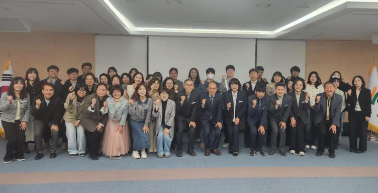 ![]() 늘봄지원실장들이 14일 교육청 집현실에서 권역별 협의체 간담회를 하고 기념사진을 찍고있다 |