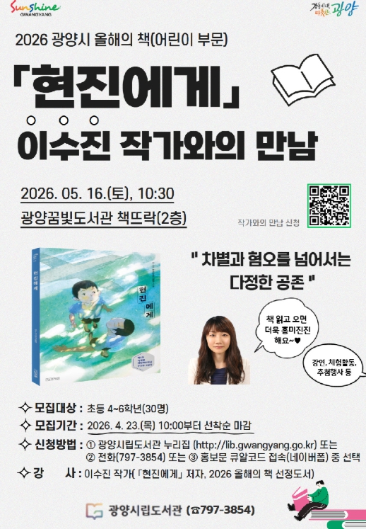 광양시 관계자는 “이번 강연이 어린이들이 작품을 이해하는 데 도움이 되길 바란다”며 “책을 읽는 즐거움과 생각을 나누는 기쁨을 느끼는 시간이 될 것”이라고 말했다.