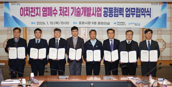 ![]() 지난 1월 15일 포항시와 경상북도는 염폐수 고도처리 기술개발과 지역 내 실증을 통한 산업 경쟁력 제고를 위해 주관기업 및 참여기관과 공동 대응을 위한 업무협약을 체결했다. |