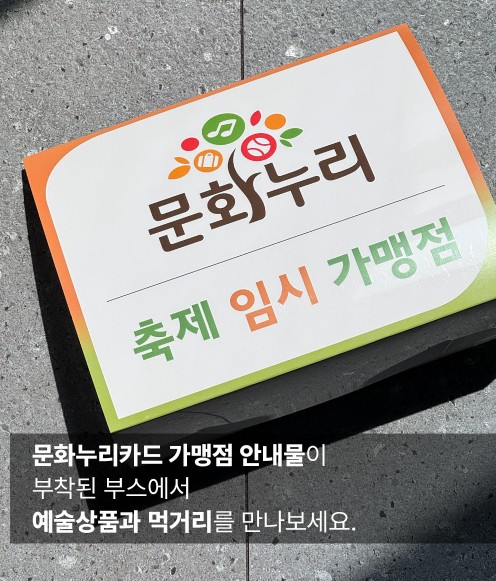 문화누리카드는 ‘축제 임시 가맹점’ 안내물이 부착된 부스에서만 사용할 수 있으며, 자세한 사항은 광주문화누리 블로그에서 확인할 수 있다.