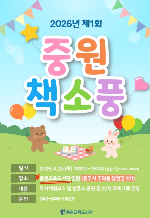신기철 중원교육문화원장은 “이번 중원책소풍이 지역 주민들이 책을 매개로 함께 소통하고 즐기는 계기가 되기를 바란다.”라며 “앞으로도 지속적인 독서문화 행사 운영을 통해 ‘언제나 책봄’ 독서문화를 확산해 나가겠다.”라고 말했다.