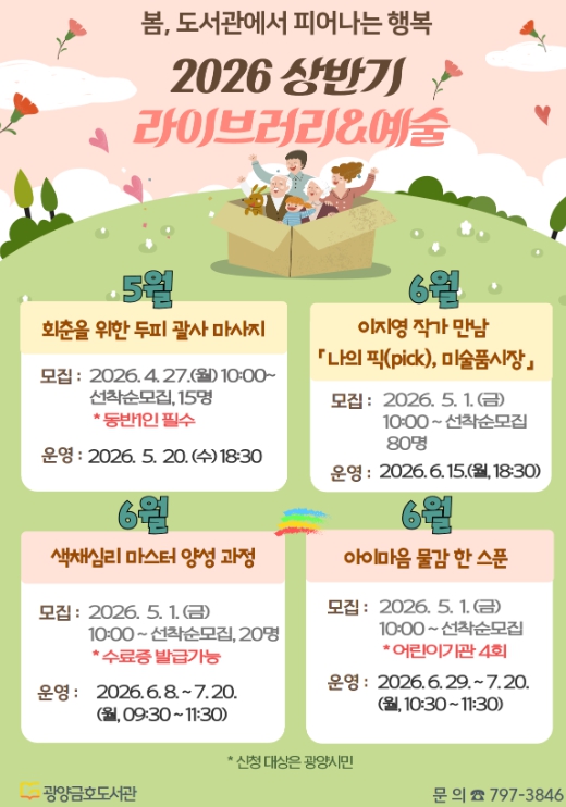 자세한 내용은 광양시립도서관 누리집에서 확인하거나 광양금호도서관으로 문의하면 된다.