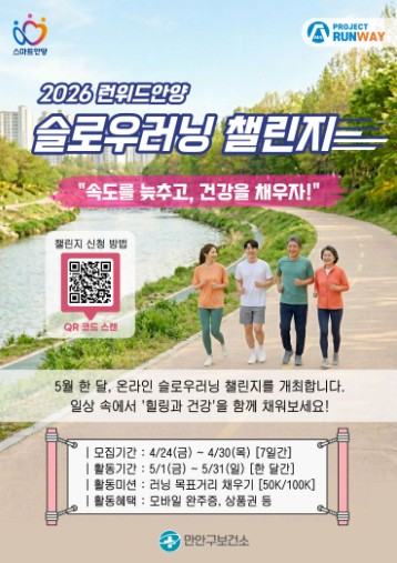 한영자 만안구보건소장은 “이번 슬로우러닝 챌린지를 통해 시민들이 속도보다는 건강에 집중하며, 달리는 즐거움을 발견하는 계기가 되길 바란다”며, “앞으로도 일상에서 체감할 수 있는 다양한 건강증진 프로그램을 통해 건강행복도시 안양을 만들어 가겠다”고 말했다.