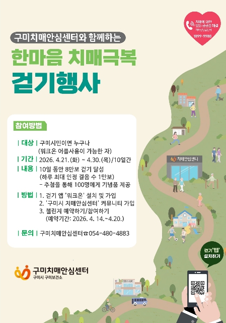 이경문 구미보건소장은 “걷기 실천을 통해 치매 예방의 중요성을 자연스럽게 알리는 계기가 될 것”이라며 “치매 환자와 가족, 지역주민이 안심하고 생활할 수 있는 환경을 만들기 위해 지속적으로 지원하겠다”고 말했다.