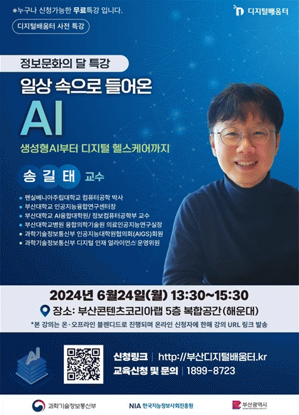 ‘인공지능 특강’은 전국 5개 권역에서 릴레이로 진행된다. 부산에서는 6월 24일 부산콘텐츠코리아랩에서 ‘일상 속으로 들어온 인공지능(AI)’이라는 주제로 생성형 인공지능(AI)과 디지털 헬스케어 관련 내용으로 부산대 인공지능융합연구센터장 송길태 교수가 강의한다.