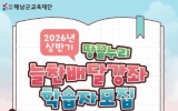 전라남도 최준규 기자2026. 01.20[시사토픽뉴스]해남군교육재단은 군민 평생학습 환경 조성을 위해 상반기 땅끝누리 늘찬배달강좌 학습자를 모집한다. 상반기 땅끝누리 늘찬배달강좌는 3월 3일부터 6월 19일까지 총 16주간 운영되며, 기간 중 총 13회 강좌로 구성된다. 운영 대상은 원칙적으로 10인 이상으로 구성된 학습팀이며, 악기를 활용한 강좌에 한해 7인 이상으로 구성된 학습팀도 신청 가능하도록 운영 기준을 적용한다. 모집 규모는 총 135팀 내외다. 특히 올해 상반기에는 기존 ‘1인 1강좌 신청’에서 동일한 학습팀원이 구성되는 조건하에 1인당 최대 2개 ...