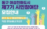동구 최준규 기자2026. 01.20[시사토픽뉴스]광주 동구는 주민이 직접 참여해 여성친화도시 정책을 만들어가는 ‘제7기 동구 여성친화도시 시민참여단’을 이달 30일까지 모집한다고 밝혔다. 여성친화도시 시민참여단은 행정 주도가 아닌 주민 참여 중심의 정책 협력 조직으로, 생활 현장에서 느끼는 문제를 발굴하고 여성친화 관점에서 개선 방안을 제안하는 역할을 수행한다. 주민의 시선에서 정책을 점검·보완함으로써 체감도 높은 여성친화도시를 조성하는 데 목적이 있다. 제7기 시민참여단은 동구에 주소를 두고 있거나 동구 소재 직장·학교에 다니는 사람을 대상으로 공개 모집하...