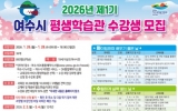 여수 최준규 기자2026. 01.19[시사토픽뉴스]여수시가 시민들의 교육 기회 확대를 위하여 평생학습관에서 제1기 정규 프로그램 수강생을 오는 1월 26일부터 28일까지 3일간 모집한다. 이번 정규 프로그램은 시민들의 평생학습 기회 확대를 위해 차별성과 실용성을 모두 갖춘 과정들로 구성됐다. 특히 AI와 인문, 예술, 운동 분야를 아우르는 최신 경향 반영 과목들이 눈길을 끈다. 주요 강좌로는 ▲Suno AI 디지털 싱글 제작 ▲AI로 만드는 섬박람회 홍보영상 제작 ▲AI 시대 안목을 높이는 로컬디자인 ▲섬, 민화를 품다 등이 있으며 36개 과목으로 총 895명...