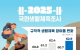 여행/맛집 최준규 기자2026. 01.19[시사토픽뉴스]문화체육관광부는 만 10세 이상인 국민 9천 명을 대상으로 시행한 ‘2025년 국민생활체육조사’ 결과를 발표했다. 2025년 생활체육 참여율(주 1회, 30분 이상)은 62.9%로, 전년 대비 2.2%포인트(p) 상승했다. 특히 주 2회 이상 참여율은 52.2%로 2.7%포인트(p) 증가했다. 연령대별로는 20대부터 60대까지의 참여율은 65% 내외로 비교적 고르게 나타났으나, 10대(43.2%)와 70대 이상(59.5%)은 다른 연령대에 비해 낮은 수준을 보였다. 주요 참여 종목은 걷기(40.5%), 보디...