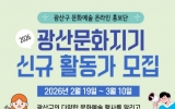 광산구 최준규 기자2026. 02.20[시사토픽뉴스]광주 광산구가 광산구 문화예술 온라인 홍보단 ‘2026년 광산문화지기’ 참여자를 3월 10일까지 모집한다. ‘광산문화지기’는 광산구의 다양한 문화예술 공연과 행사 현장을 직접 취재하고, 누리소통망(SNS)에 생생한 후기를 작성, 공유하는 온라인 홍보단이다. 광산문화지기는 4월부터 12월까지 약 9개월간 활동한다. 모집 인원은 10명 내외로, 문화예술에 관심이 많고 누리소통망(SNS) 활용이 능숙한 시민이라면 누구나 참여할 수 있다. 참여 방법은 광산구 누리집 새소식에서 신청 서류를 내려받아 3월 10일까지 전자우...
