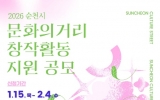 순천 최준규 기자2026. 01.15[시사토픽뉴스]순천시는 문화의 거리를 예술특화 거점지역으로 육성하고 지역 예술인의 지속가능한 창작활동을 지원하기 위해 ‘2026년 순천시 문화의 거리 창작활동 지원사업’ 참여자를 공개 모집한다고 밝혔다. 공모 대상은 문화의 거리 구역인 영동․행동 전역과 금곡동 일부 지역에서 문화예술 업종을 운영하거나 거주 중인 주민이다. 지원 분야는 체험, 전시, 공연 등 문화예술 관련 프로그램으로, 지원규모는 체험 최대 200만 원, 전시 400만 원, 공연 500만 원 이내이다. 신청 기간은 1월 15일부터 2월 4일까지이며, 신청 방법...