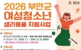 부안군 최준규 기자2026. 01.14[시사토픽뉴스]부안군은 여성청소년의 건강한 성장을 위해 부안군 생리용품 지원사업 조례를 제정해 지난 2022년부터 여성청소년 생리용품 지원사업을 지속적으로 추진하고 있다고 밝혔다. 지원대상은 소득수준과 관계없이 부안군에 주소를 둔 11세부터 18세까지의 여성청소년으로, 2026년 기준 2008년 1월 1일~2015년 12월 31일 사이 출생자이다. 단, 다른 법령에 근거해 생리용품을 지원받는 대상자는 중복으로 신청할 수 없다. 신청은 청소년 주소지 읍·면사무소에서 청소년 본인 또는 주양육자가 방문해 1월 12일부터 12월 1...
