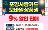 익산시 최준규 기자2026. 01.12[시사토픽뉴스] 포항시는 오는 16일부터 2026년 카드형·모바일 포항사랑상품권(이하 포항사랑카드)의 첫 할인판매를 시작한다. 이번 할인판매는 연초 민생경제 회복과 활력 제고를 위해 선제적으로 마련됐으며, 230억 원 규모로 9% 할인 판매로 진행된다. 지역 골목상권과 전통시장에 활력을 불어넣을 수 있기를 기대하고 있다. 시는 올해 포항사랑상품권 발행 규모를 지난해 대비 500억 원을 확대해 총 3,500억 원을 발행하고, 상시(매월)는 포항사랑카드 9% 할인, 명절에는 포항사랑카드와 지류형 상품권을 10% 특별할인...