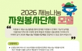 여수 최준규 기자2026. 01.12[시사토픽뉴스]여수시는 오늘(12일)부터 오는 2월 25일까지 ‘2026년 찾아가는 재능나눔 프로그램’에 참여할 자원봉사 단체를 모집한다. 해당 프로그램은 민간단체의 재능기부 활동으로 지역사회의 다양한 문제를 해결하고, 2026 여수세계섬박람회 개최 전 자원봉사자의 관심 유도 및 활성화를 위해 매년 추진되고 있다. 모집 대상은 ▲주거환경개선 ▲의료‧보건 ▲이‧미용 ▲음식 나눔 ▲박람회 홍보 등 5개 분야로 재능이 있고 6개월 이상 활동이 가능한 봉사단체다. 참여를 희망하는 단체는 시 누리집 공지사항을 참고하여 신청서 작성 후 ...