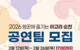 순천 최준규 기자2026. 02.12[시사토픽뉴스](재)순천문화재단은 오는 26일까지 ‘2026 항꾼에 즐기는 아고라 순천’ 문화예술 공연팀을 공개 모집한다고 밝혔다. 올해로 14년째 진행되는 아고라 순천은 그동안 축적해 온 열린 무대경험을 바탕으로 일상에서 시민 누구나 접근 가능한 공공 공연 플랫폼으로 지역 예술인들이 지속적으로 성장할 수 있는 지역 대표 공연 브랜드로 자리매김했다. 이번 공모는 사업 공고일 기준 순천시 거주 예술가(예술단체)로 해당 분야 전공자 등 공연 역량을 갖춘 개인 및 단체라면 지원할 수 있다. 모집 규모는 총 5개 장르 ▲대중음악 ▲...