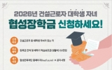 전라북도 최준규 기자2025. 12.08[시사토픽뉴스]건설근로자공제회(이사장 직무대행 권혁태)와 협성문화재단(이사장 박석귀)은 건설근로자의 대학생 자녀 학업 지원을 위해 ‘2026년 신규 협성장학생’을 선발한다. 지원대상은 건설근로자공제회에 등록된 건설근로자로 총 적립일수가 600일 이상이고, 2025년도 근로내역은 최소 100일이다. 건설근로자의 자녀 가운데 국내 4년제 대학 신입생과 2026년 기준 2~3학년 재학생을 대상으로 장학생을 모집한다. 선발 인원은 20명 내외다. 제출서류, 심사기준은 협성문화재단 홈페이지 내 공지사항을 통해 확인할 수 있다. 접수...