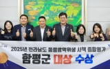 장성 최준규 기자2025. 12.11[시사토픽뉴스]전남 함평군이 가축방역 및 축산물 위생 분야에서 3년 연속 우수한 성과를 거두며 뛰어난 행정 역량을 다시 한번 입증했다. 함평군은 11일 “2025년 전라남도 동물방역위생 시책평가에서 대상을 수상했다”고 밝혔다. 앞서 함평군은 같은 평가에서 2023년 대상, 2024년 최우수상에 이어 올해 다시 한번 대상을 차지하는 동물방역위생 선도 지자체로서의 위상을 더욱 공고히 했다. 이번 평가는 전남 22개 시군을 대상으로 방역정책·동물방역·축산물 위생·방역 대응 등 4개 분야로 진행됐다. 함평군은 4개 지표에서 고르...