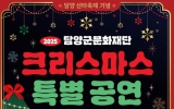 광주광역시 최준규 기자2025. 12.16[시사토픽뉴스] 담양군문화재단은 연말연시를 맞아 ‘제7회 담양산타축제’와 연계한 ‘2025 크리스마스 특별 공연’을 12월 24일부터 25일까지 이틀간 담양읍 중앙공원 일원에서 개최한다. 이번 공연은 군민과 관광객에게 문화 향유 기회를 제공하고, 거리 공연을 통해 원도심 유동 인구를 늘려 지역 상권 활성화로 이어가기 위해 마련됐다. 공연은 매일 오후 2시부터 5시까지 진행된다. 행사 첫날인 24일에는 정용주, 공성길, 주현 등 포크 가수들이 무대에 오르며, 전남도립대 버스킹팀과 여신콜라보예술단이 함께 참여해 크리스...