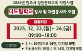 사회 최준규 기자2025. 12.16[시사토픽뉴스]원주시 평생교육원 학습관에서 12월 22일부터 26일까지 2026년 원주시 성인문해교육 지원사업 '더드림학교' 강사 및 자원봉사자를 모집한다. 이번 문해교육 강사는 학령기 교육의 기회를 놓친 비문해 성인을 대상으로 더디딤 6개반, 더채움(성인생활문해) 5개반, 더열림(찾아가는 성인문해교실) 3개반, 더터치(디지털문해) 5개반 등 전문적인 문해교육을 수행할 교육강사 19명, 자원봉사자 19명, 총 38명을 모집한다. 지원자는 신청서를 작성해 평생교육원 학습관에 방문 접수하면 되고, 선발은 1차 서류 심사와 2차 면접...