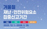 군산시 최준규 기자2025. 12.04[시사토픽뉴스]군산시가 12월부터 내년 2월까지 ‘겨울철 재난·안전 위험요소 집중신고 기간’을 운영한다고 4일 밝혔다. 이번 기간에는 겨울철에 발생 가능성이 높은 ▲대설 ▲ 한파 ▲화재 ▲축제·행사 등 4가지 유형의 위험 요소를 대상으로 시민이 직접 신고할 수 있다. ‘대설’ 분야는 △도로 제설 미흡 △제설함 관리 불량 △시설물 붕괴 위험이며, ‘한파’ 분야는 △인도 결빙 △고드름 낙하 △한파 쉼터 불편 등이다. ‘화재’ 분야는 △비상구 물건 적치 △소화 시설 불량 △불법 취사·소각 등이고, ‘축제·행사’ 분야는 △인파 밀집 ...