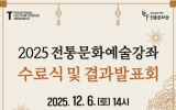 서구 최준규 기자2025. 12.03[시사토픽뉴스]광주문화재단 전통문화관은 오는 12월 6일 오후 2시 전통문화관에서 광주광역시 무형유산 보유자와 수강생이 함께하는 ‘2025 전통문화예술강좌 수료식 및 결과발표회’를 개최한다. 이번 행사는 상·하반기 총 26개 강좌에서 강좌별 15회차 중 70% 이상 출석한 수강생에게 수료증을 수여하고, 무형유산 기·예능 보유자 및 전문강사에게 직접 배운 기량을 선보이기 위해 마련됐다. 수료식은 상·하반기 수강생 수료증 전달식에 이어 1부 기능분야(탱화, 민화, 전통음식) 발표회, 2부 예능분야(판소리, 판소리고법, 가야금병창) ...