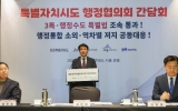 전라북도 최준규 기자2026. 02.08[시사토픽뉴스]최민호 세종특별자치시장이 특정 지역에 예외적 특례를 몰아주는 행정통합 기조에 대해 강한 우려를 표하며, 세종시법 개정과 교부세 정상화, 행정수도 특별법 등의 조속한 제정을 거듭 촉구했다. 최민호 시장은 8일 서울에서 열린 ‘대한민국특별자치시도 행정협의회’ 간담회에 참석해 세종·제주·강원·전북 4개 특별자치시도의 공동 대응방안을 논의한 뒤 이같은 내용을 담은 입장문을 발표했다. 이번 행정협의회는 최근 정부가 통합특별시에 재정 인센티브를 약속하고 국회도 특별법안 처리 시기를 서두르는 데 비해 특별자치시도에 대한 지...