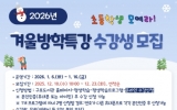 교육 최준규 기자2025. 12.09[시사토픽뉴스] 부산광역시립구포도서관(관장 신미향)은 다음달 6일부터 16일까지 구포도서관에서 초등학생 78명을 대상으로 ‘2026 겨울방학 특강’을 운영한다. 이번 특강은 겨울방학 기간 발생할 수 있는 학습 공백을 줄이고, 초등학생의 문해력·수리력·창의력 등 미래 핵심 역량을 균형 있게 기를 수 있도록 지원하기 위해 마련했다. 특강은 학년별 발달 수준을 고려한 체험 중심 프로그램으로 구성했다. 저학년을 대상으로는 수리력과 문해력을 키우는 ▲‘수 감각이 톡톡! 수학놀이터’ ▲‘문해력이 자라는 스토리 베이킹’, 말하기 자신감을...