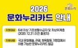 진안군 최준규 기자2026. 02.02[시사토픽뉴스]광주문화재단(대표이사 직무대행 전은옥)은 2월 2일부터 6세 이상 기초생활수급자 및 차상위계층을 대상으로 2026년 문화누리카드 발급과 사용이 가능하다고 밝혔다. 2026년 문화누리카드 지원금은 지난해 대비 1만 원 인상된 1인당 15만 원이며, 청소년기(2008~2013년생)와 준고령기(1962~1966년생) 대상자에게는 1만 원이 추가 지원된다. 카드 발급 기간은 2월 2일부터 11월 30일까지로, 광주광역시 96개 동 행정복지센터에 방문하거나, 문화누리카드 누리집과 모바일 앱, 고객센터 ARS를 통해 발...
