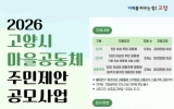 사회 최준규 기자2025. 12.22[시사토픽뉴스]고양특례시는 이웃과 함께 마을 활동에 참여하며 주민 스스로 지역 문제를 해결해 나가는 ‘2026년 고양시 마을공동체 주민제안 공모사업’에 참여할 공동체를 내년 1월 19일부터 모집한다고 밝혔다. 이번 공모사업은 마을공동체 활동을 확산하고 공동체 간 네트워크를 형성해, 주민 주도로 지역사회의 다양한 문제를 해결함으로써 살기 좋은 지역사회를 만들어가기 위해 추진된다. 지원 대상은 고양시에 거주하거나 활동 중인 주민 모임으로 △(1단계) 5인 이상 △(2단계 및 공동주택) 10인 이상의 공동체다. 참여를 희망하는 공동체...