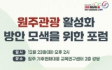 사회 최준규 기자2025. 12.22[시사토픽뉴스]원주시는 오는 23일 오후 2시, 기후변화대응교육연구센터 2층 대강당에서 ‘원주관광 활성화 방안 모색을 위한 포럼’을 개최한다. 이번 포럼은 원주시와 강원일보가 공동으로 주최하고, 한국관광공사와 (재)강원관광재단이 후원한다. 원주 관광산업의 현주소를 진단하고 타 지역의 우수사례를 공유해, 원주관광의 발전 방향을 제시하는 자리이자, 원주 관광산업 활성화를 위한 다양한 방안과 대안을 모색하는 장이 될 전망이다. 포럼은 상상콘텐츠연구소 이종원 소장의 ‘여행작가가 바라본 강원특별자치도 원주시’ 기조강연으로 시작된다. 이어...