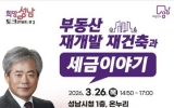 사회 최준규 기자2026. 03.18[시사토픽뉴스]성남시는 오는 3월 26일 오후 2시 50분 시청 1층 온누리에서 ‘부동산·재개발 재건축과 세금 이야기’를 주제로 한 명사 초빙 강연을 연다. 이번 강연은 앞선 2월 24일 부모 교육 특강에 이어 올해 두 번째 개최하는 ‘희망성남 토크콘서트’다. 시는 이날 강연자로 안수남 세무법인다솔 대표이사(세무사)를 초빙한다. 강연자는 최근 급격하게 변화하는 부동산 시장과 현 정부의 주요 정책, 재개발 재건축 분야 세금에 대해 강연을 펼친다. 성남시 전 지역에서 관심이 집중되고 있는 재건축 재개발 사업과 관련해 사업 절차,...