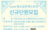 교육 최준규 기자2026. 01.22[시사토픽뉴스]인천광역시교육청학생교육문화회관은 3월 21일 ‘2026학년도 청소년오케스트라 단원 모집 오디션’을 실시한다. 이번 모집은 인천 관내 초 ․ 중 ․ 고등학교 재학생과 학교 밖 청소년을 대상으로 하며, 1월 20일부터 2월 11일 오후 4시까지 모바일 링크로 신청할 수 있다. 오디션을 거쳐 선발된 단원은 바이올린, 첼로 등 10개 분야 전문 강사로부터 정기수업과 집중연습 등 지도를 받으며 정기연주회, 협연 오디션 등 다양한 예술활동에 참여하게 된다. 학생교육문화회관 관계자는 “AI시대를 살아갈 학생들이 미래의 불투명...