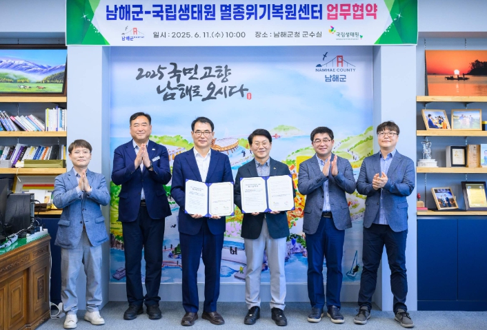 협약식에는 국립생태원 멸종위기종복원센터 측에서 최승운 센터장, 최인수 복원교육실장, 도재화 서식지복원팀장을 비롯한 8명이, 남해군에서는 장충남 군수, 하홍태 해양환경국장, 감홍경 환경과장 등 8명이 참석했다.