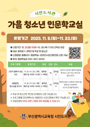 ![]() 부산시민도서관, ‘가을 청소년 인문학교실’운영 |