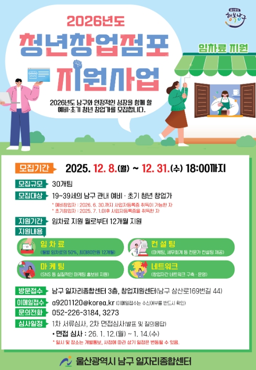 남구 관계자는 “청년창업점포 지원사업으로 창업 초기 경제적으로 어려움을 겪는 청년들에게 실질적인 도움이 되길 바라며, 청년 창업자들이 창업의 꿈을 실현하고 지역 경제 구성원으로 자리매김할 수 있도록 최선을 다하겠다”고 밝혔다.