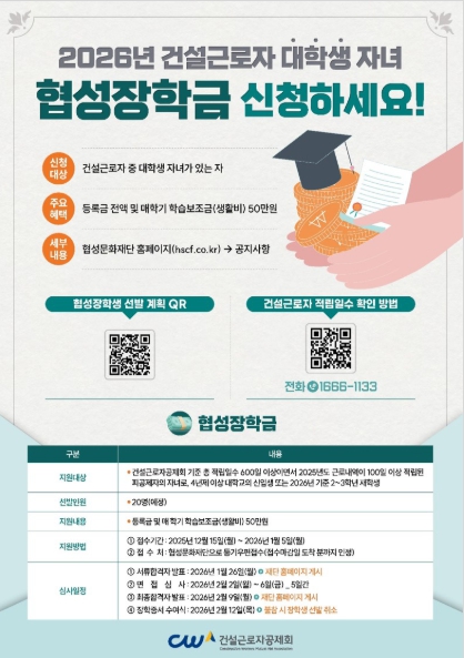 ![]() [포스터] 2026년 건설근로자 대학생 자녀 협성장학금 |