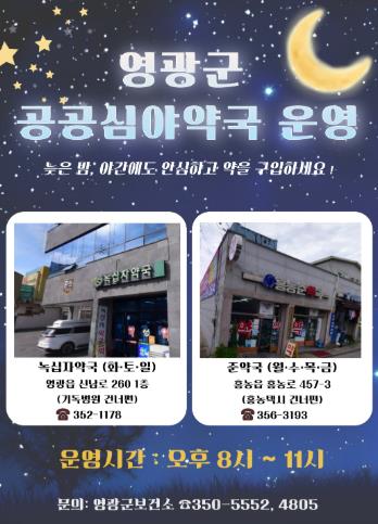 이번에 지정된 공공심야약국은 요일별로 운영되며, ▲녹십자약국은 화·토·일요일(영광읍 신남로 260 1층), ▲준약국은 월·수·목·금요일(홍농읍 홍농로 457-3)에 운영된다.